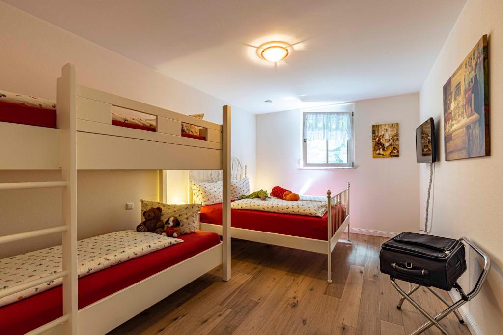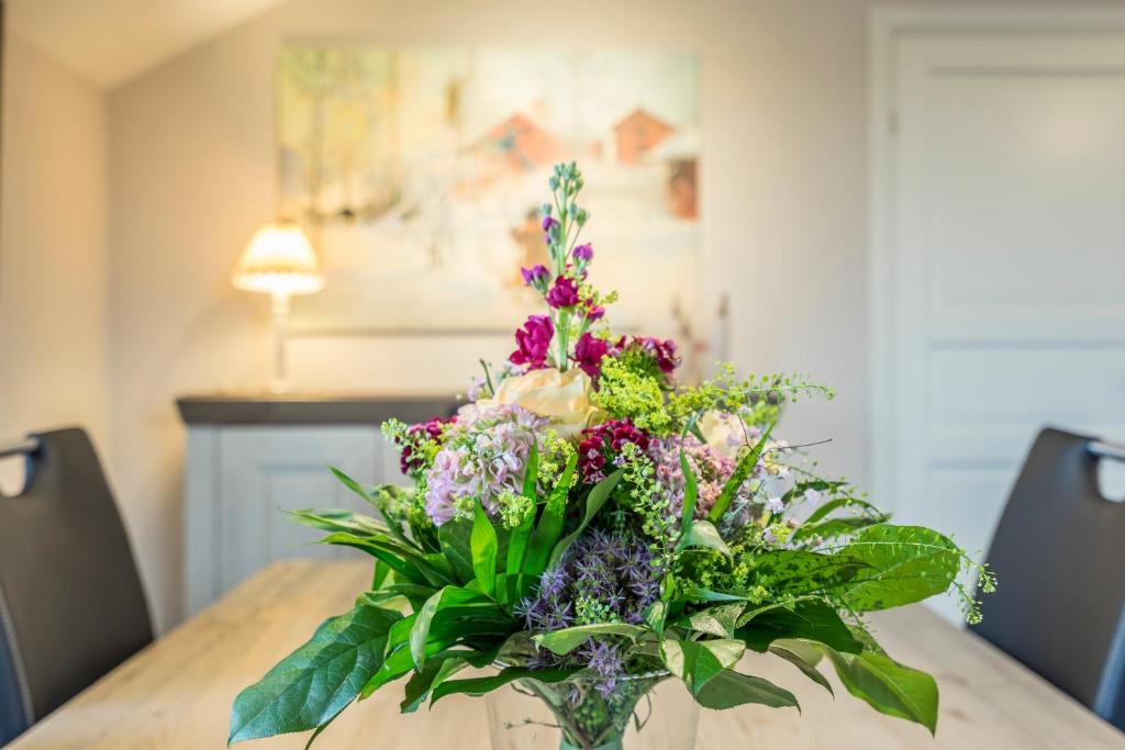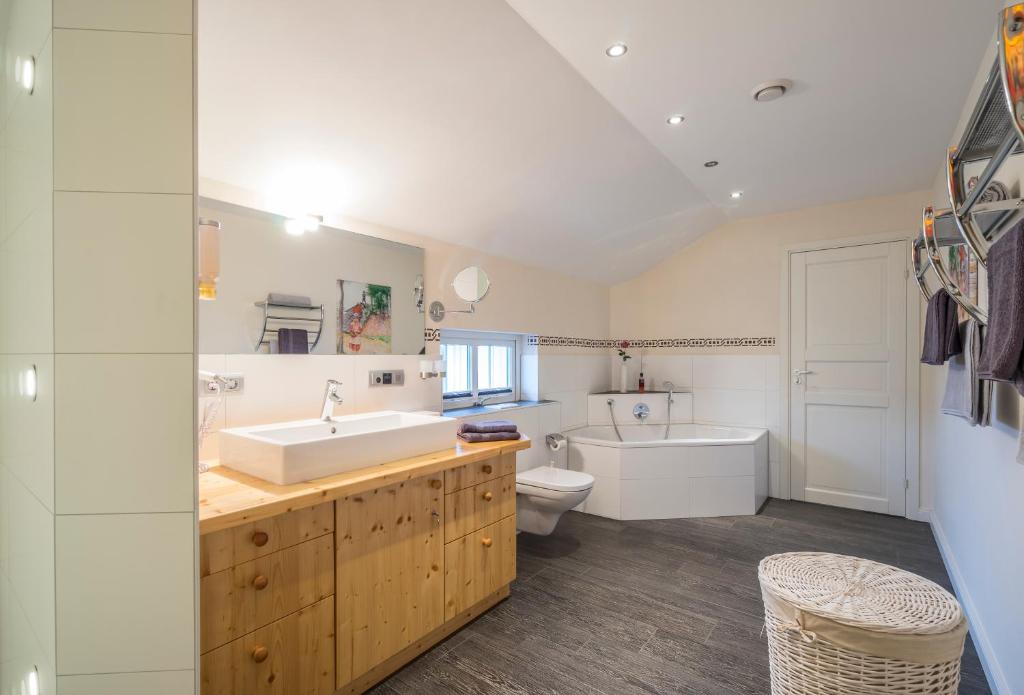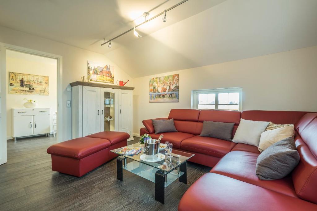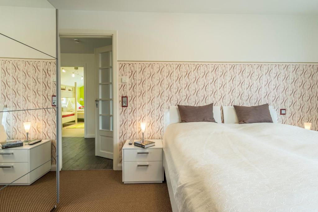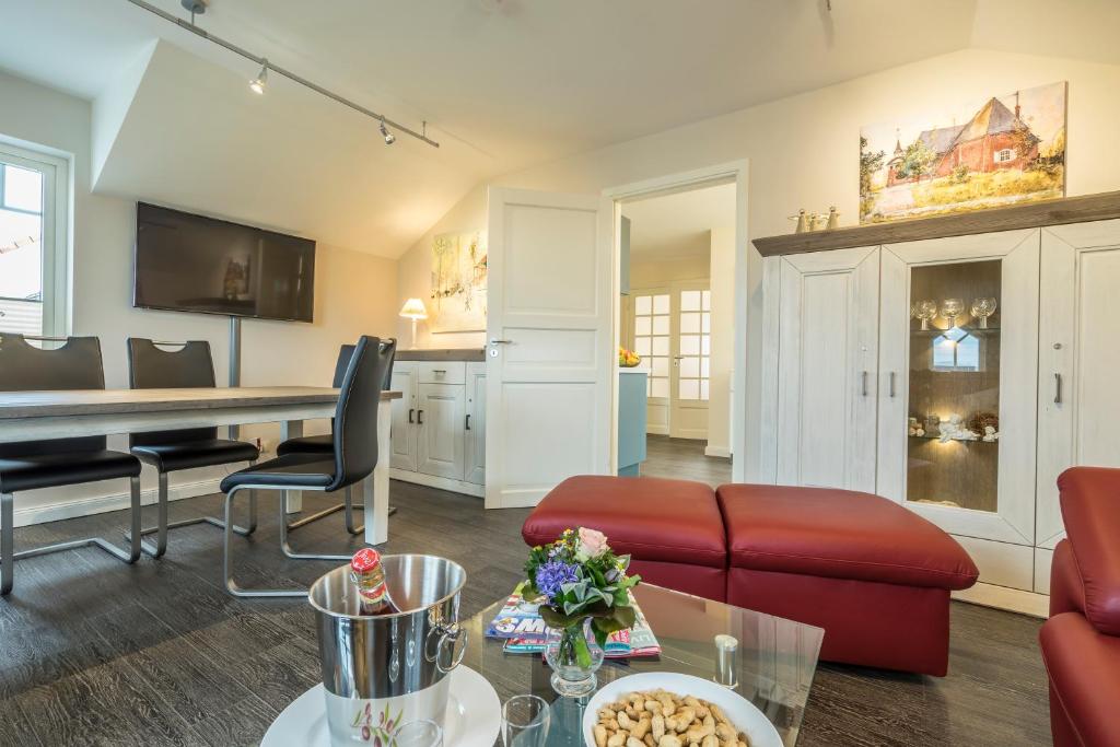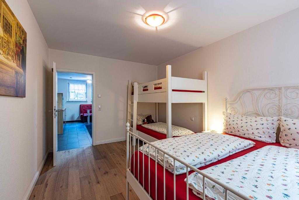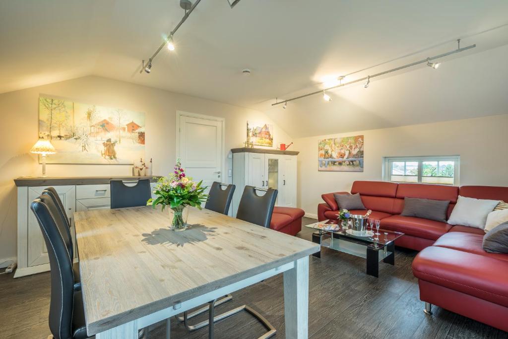 Our apartment on the upper floor has 80 square meters of living space. You have 2 bedrooms, 1 large bathroom with a bathtub, a living and dining room, as well as a kitchen at your disposal. The accommodation features a flat-screen satellite TV as well as a seating and dining area in the living room. The kitchen is equipped with a dishwasher, an oven, a microwave, a toaster, a refrigerator, and a coffee machine. There is a private bathroom with a shower and an additional bathtub. Towels and bed linen are provided for you.