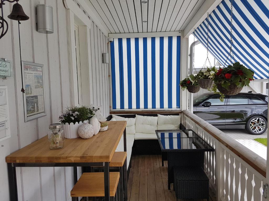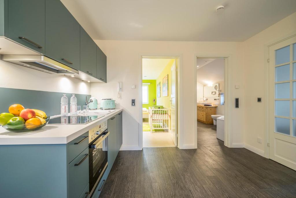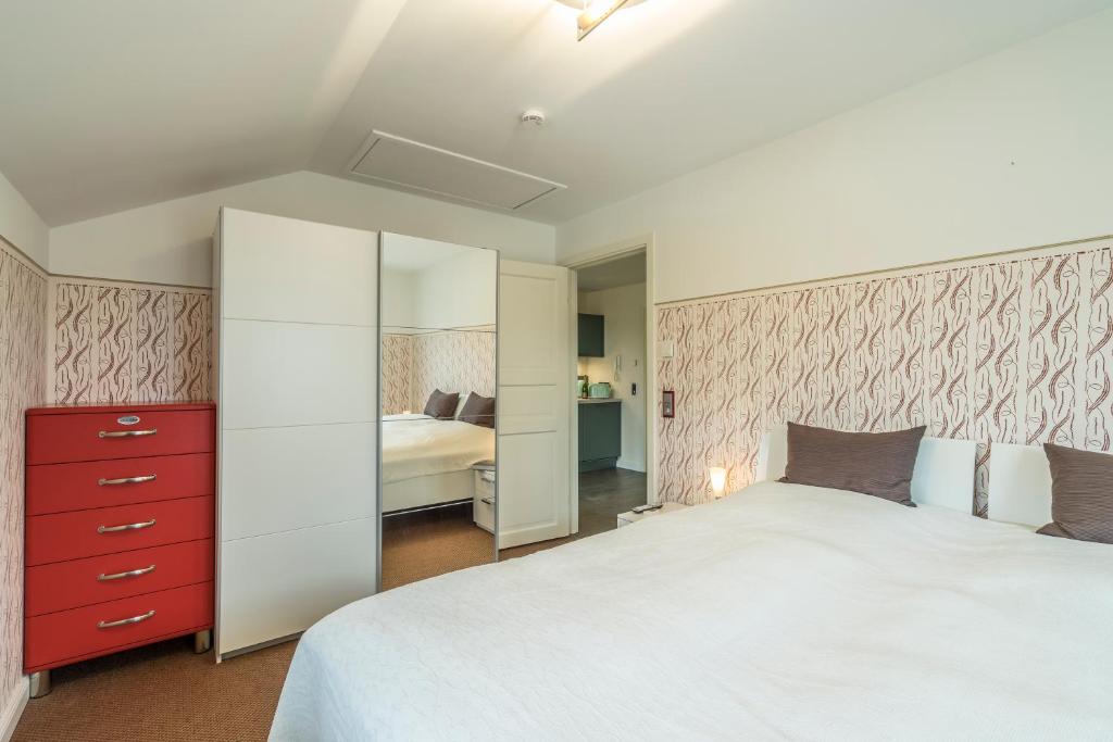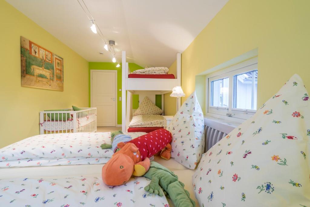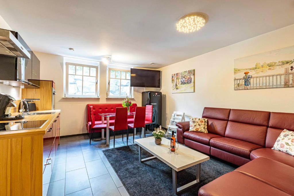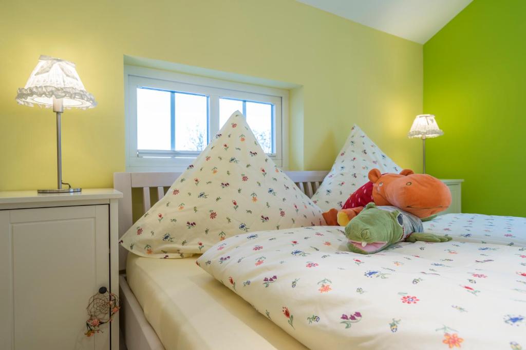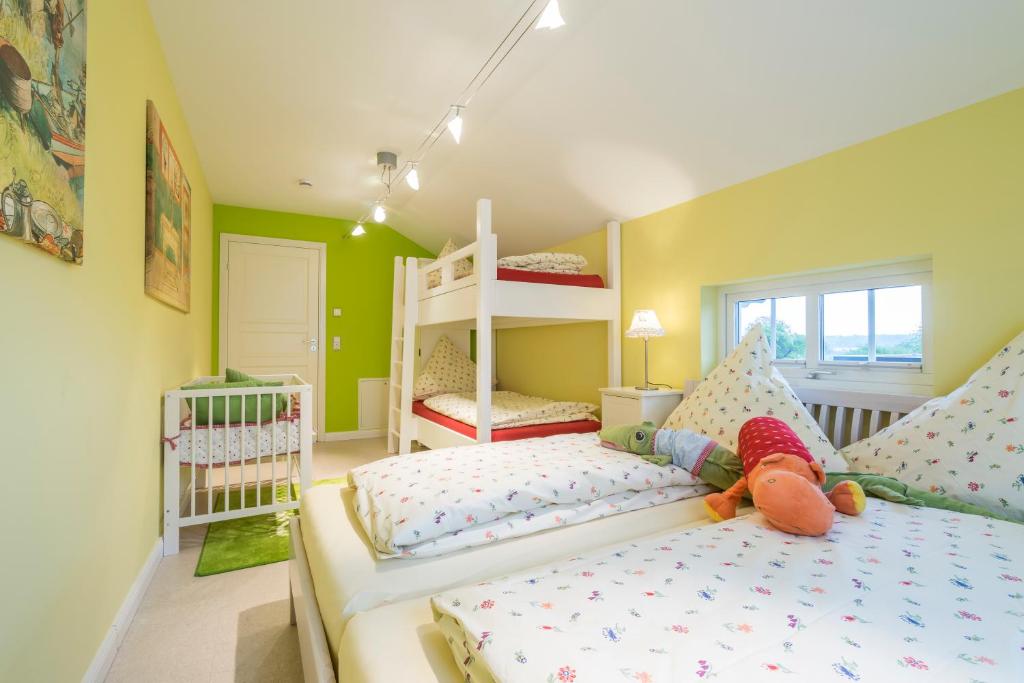 Our apartment on the upper floor has 80 square meters of living space. You have 2 bedrooms, 1 large bathroom with a bathtub, a living and dining room, as well as a kitchen at your disposal. The accommodation features a flat-screen satellite TV as well as a seating and dining area in the living room. The kitchen is equipped with a dishwasher, an oven, a microwave, a toaster, a refrigerator, and a coffee machine. There is a private bathroom with a shower and an additional bathtub. Towels and bed linen are provided for you.